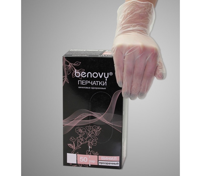 Перчатки виниловые одноразовые, нестерильные, прозрачные.